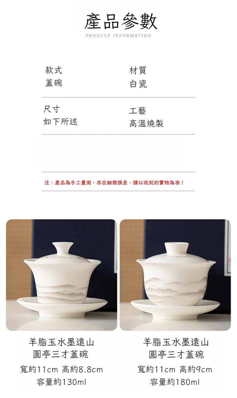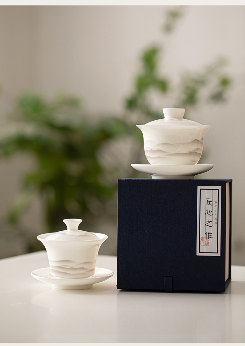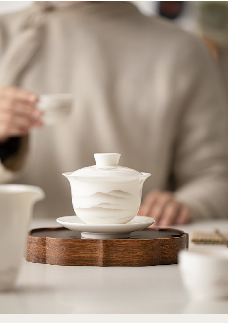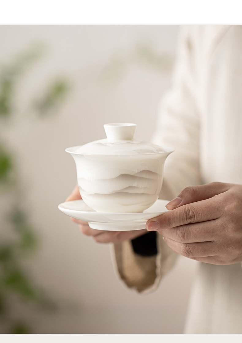 羊脂玉水墨遠山【圓亭三才蓋碗】