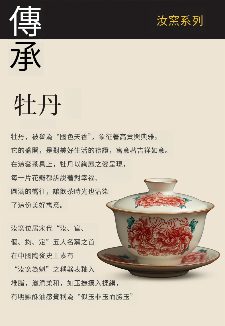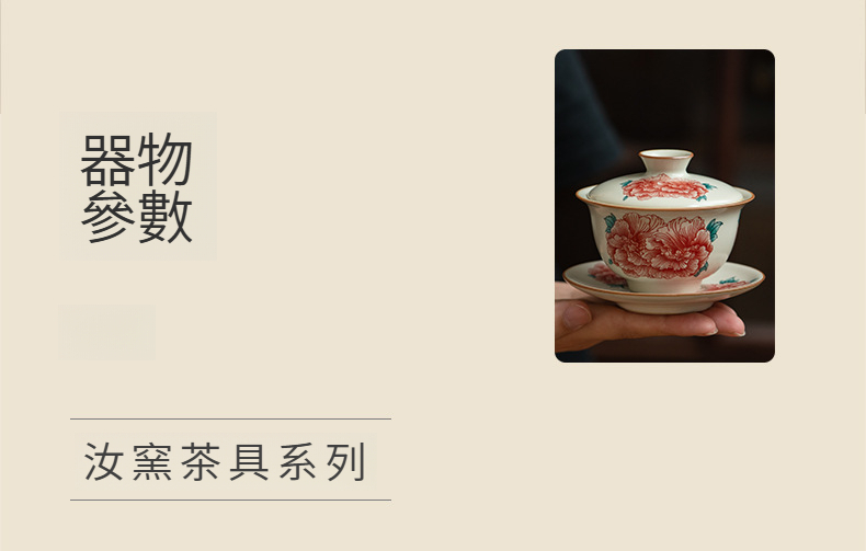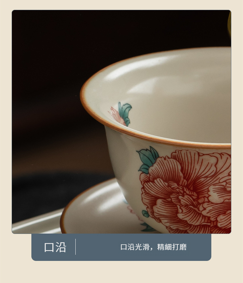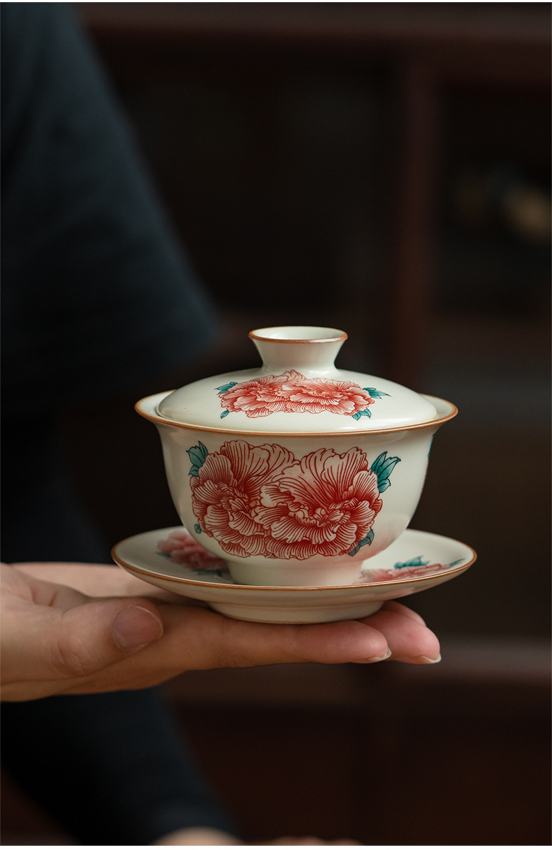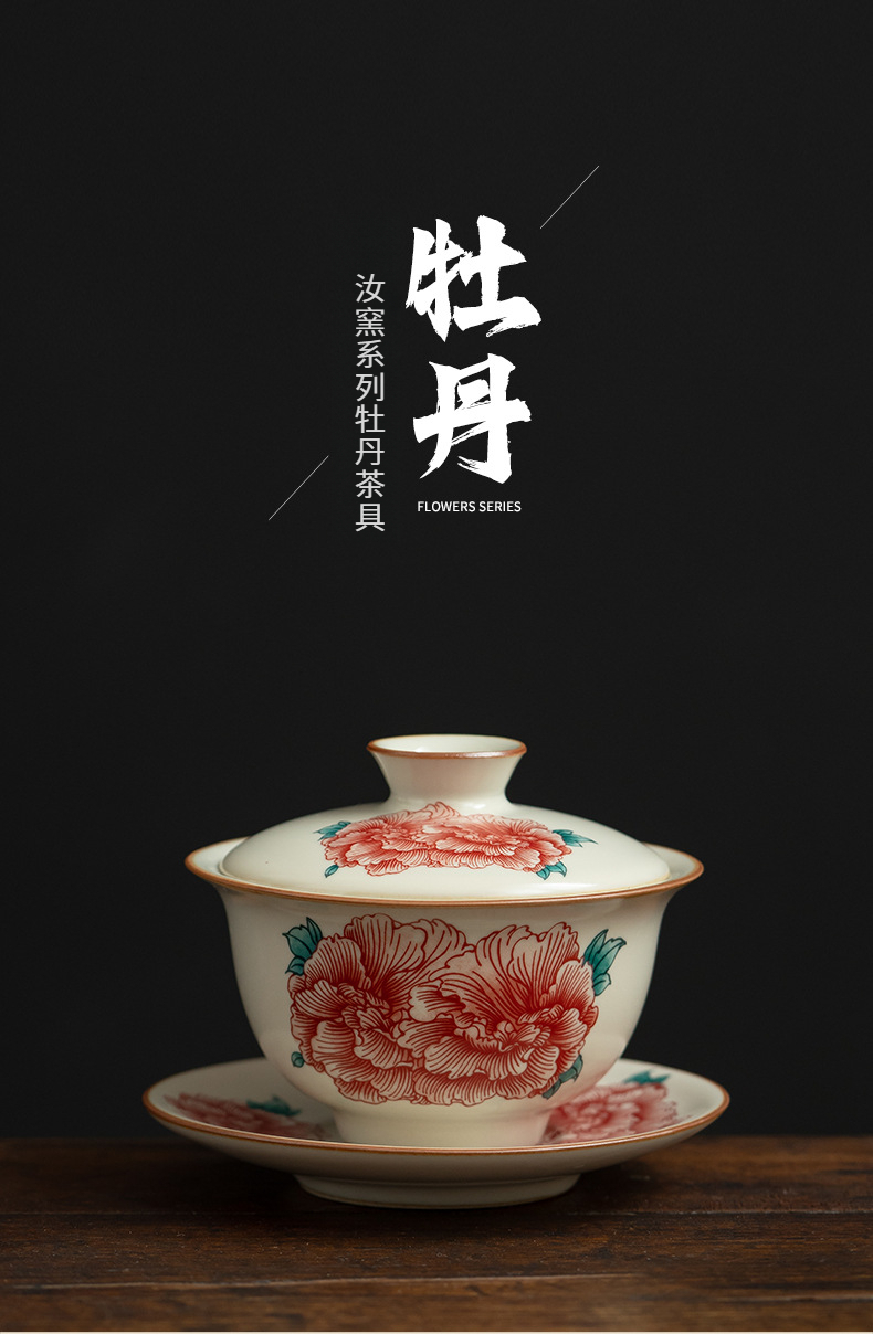 汝窯牡丹花三才蓋碗茶杯