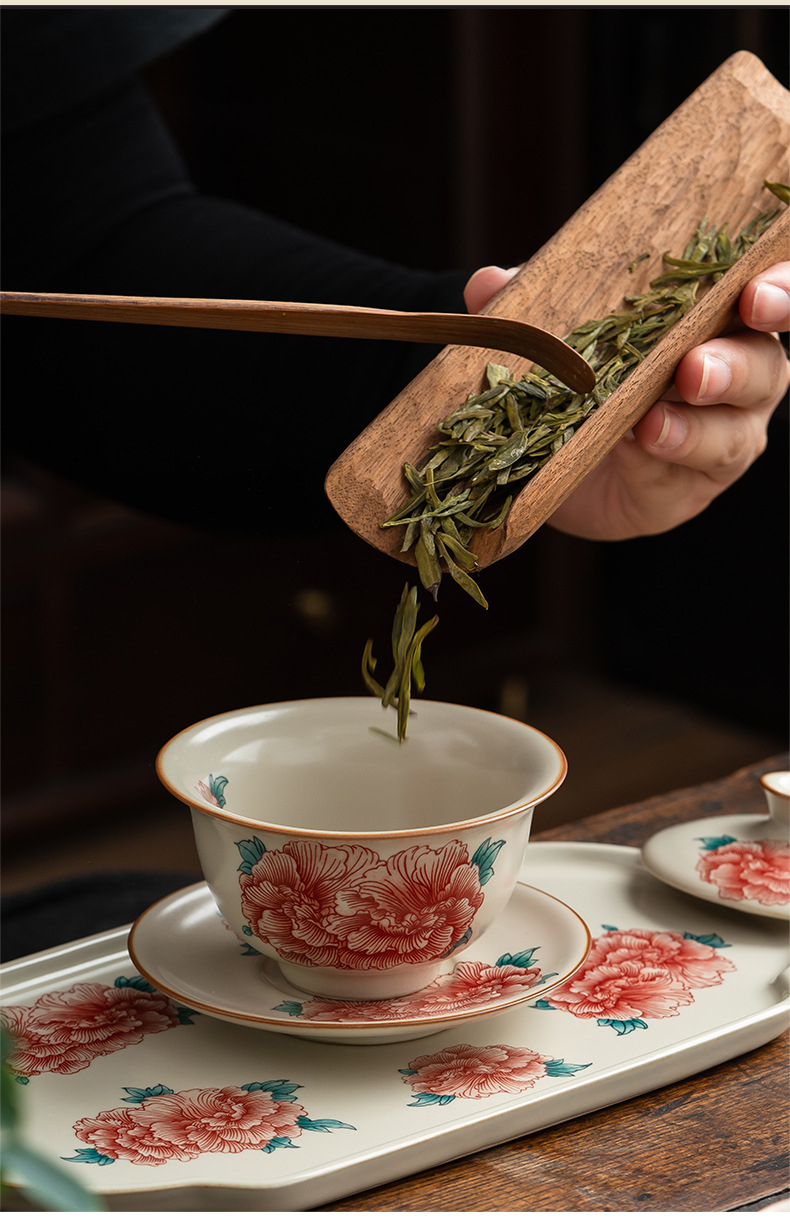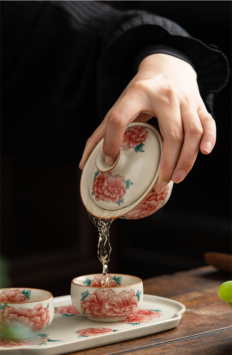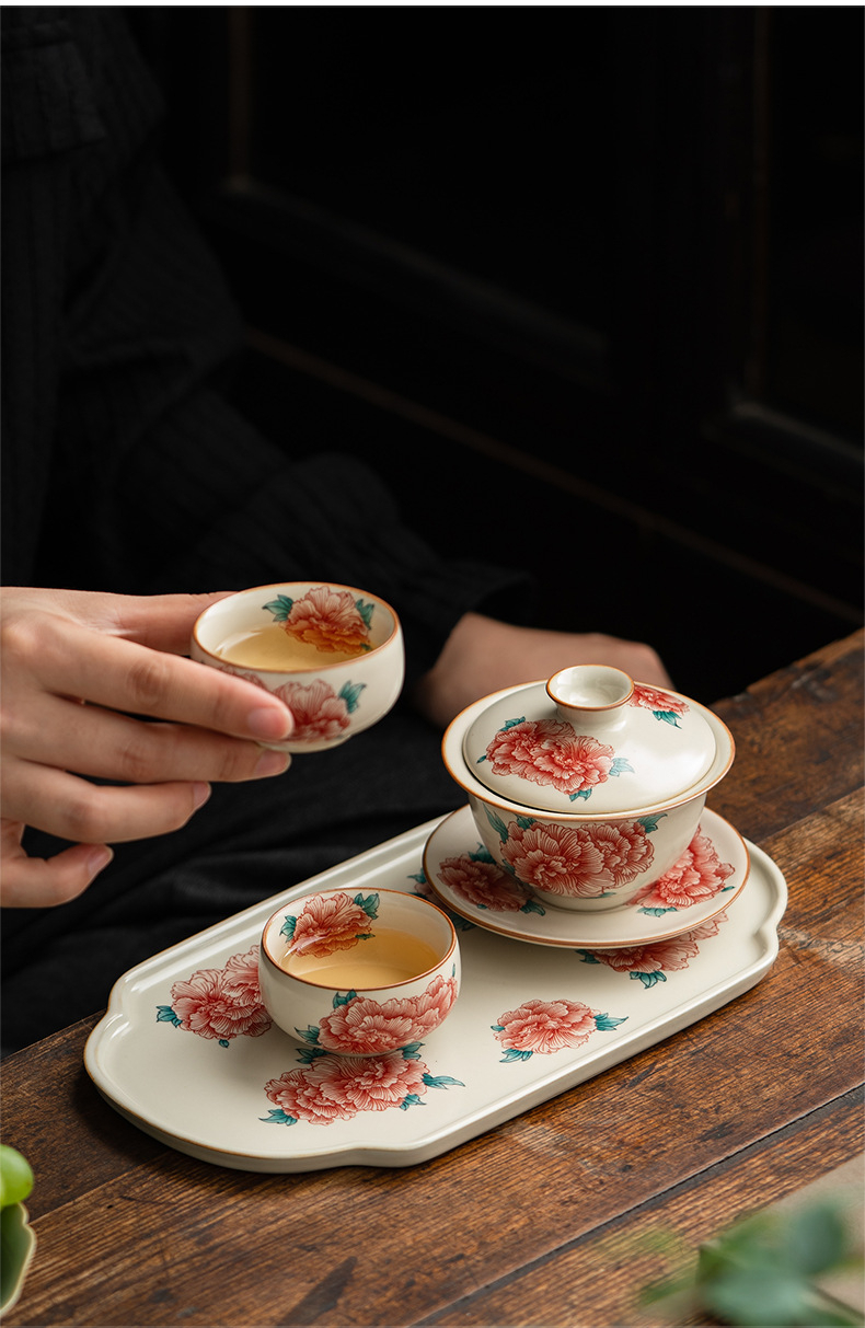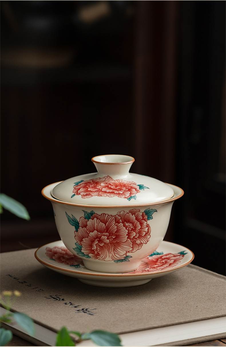 汝窯牡丹花三才蓋碗茶杯