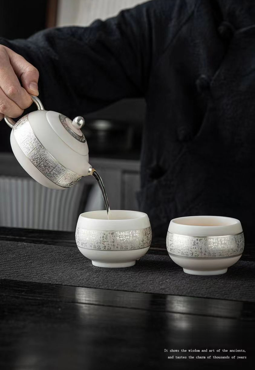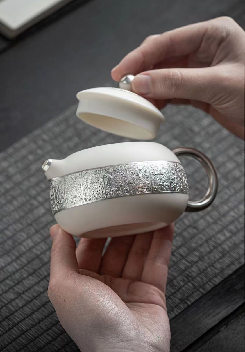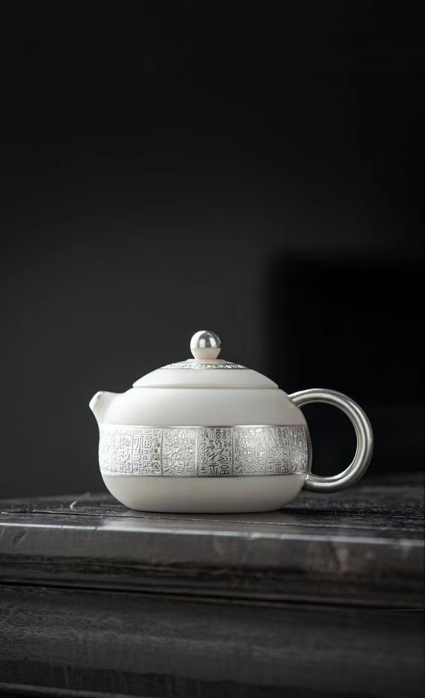羊脂玉鎏銀百福西施壺主人杯