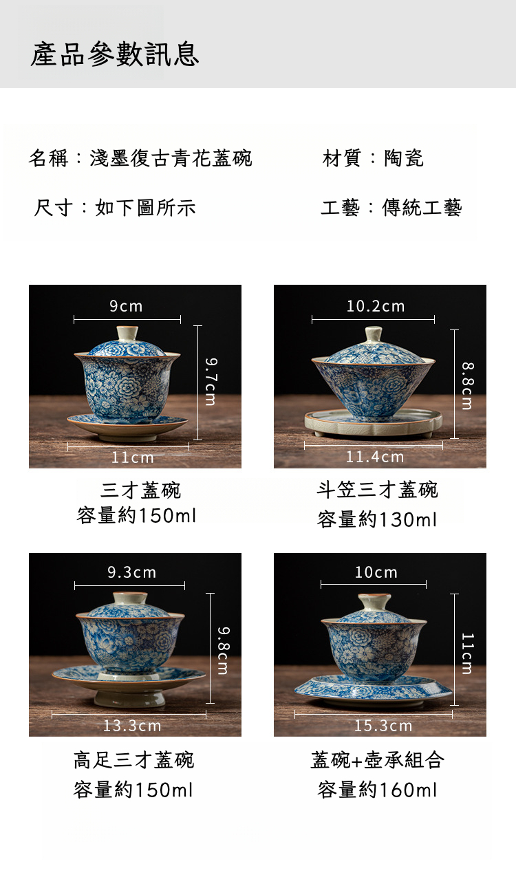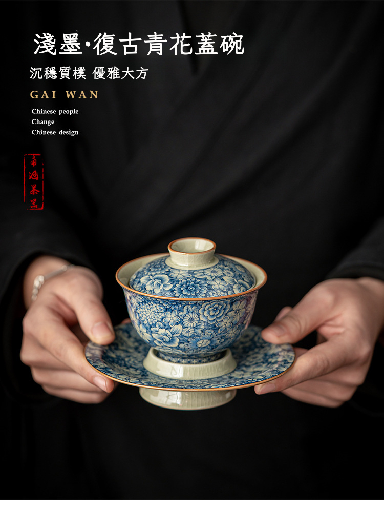 淺墨復古青花斗笠三才蓋碗